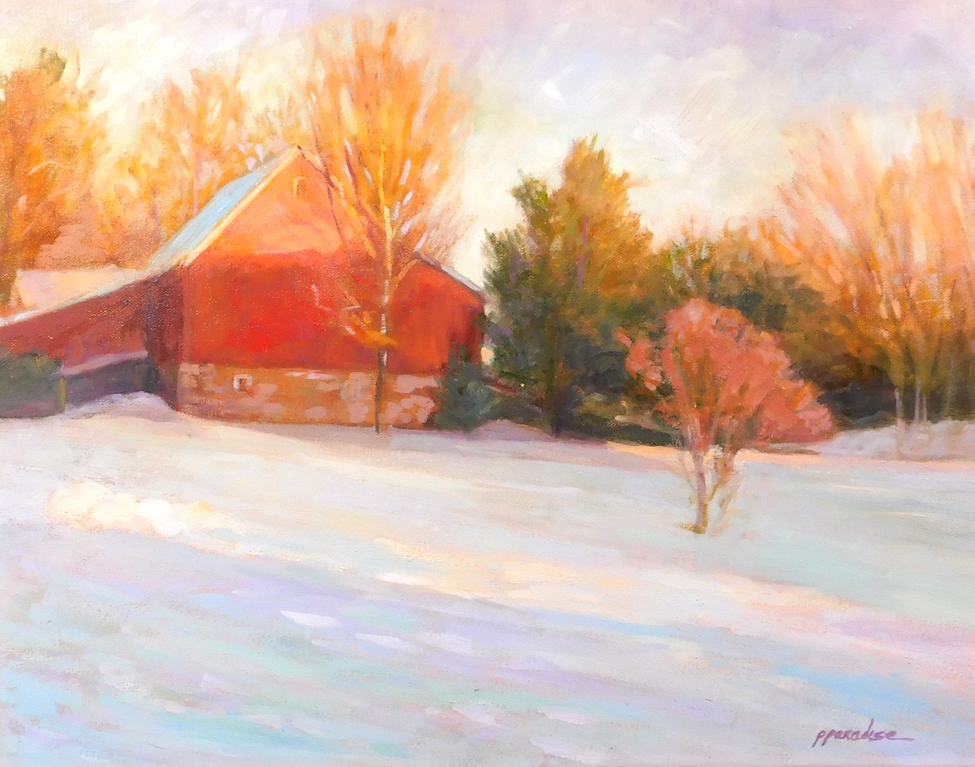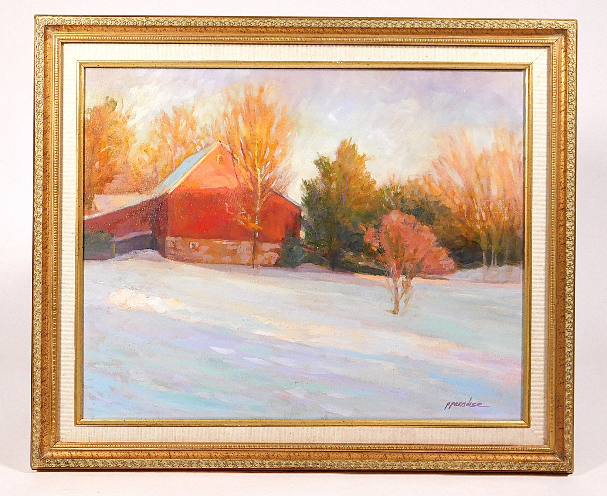 Paula Paradise (Massachusetts / Pennsylvania, b. 1956), Red Barn In Winter, Oil on Canvas, likely set in Bucks County, PA, depicting a red barn with snow on the ground, bare trees with light shining down through the trees, signed lower right, framed, wear consistent with age, Frame: 20"H by 23"W ss:15"H by 19.5"W